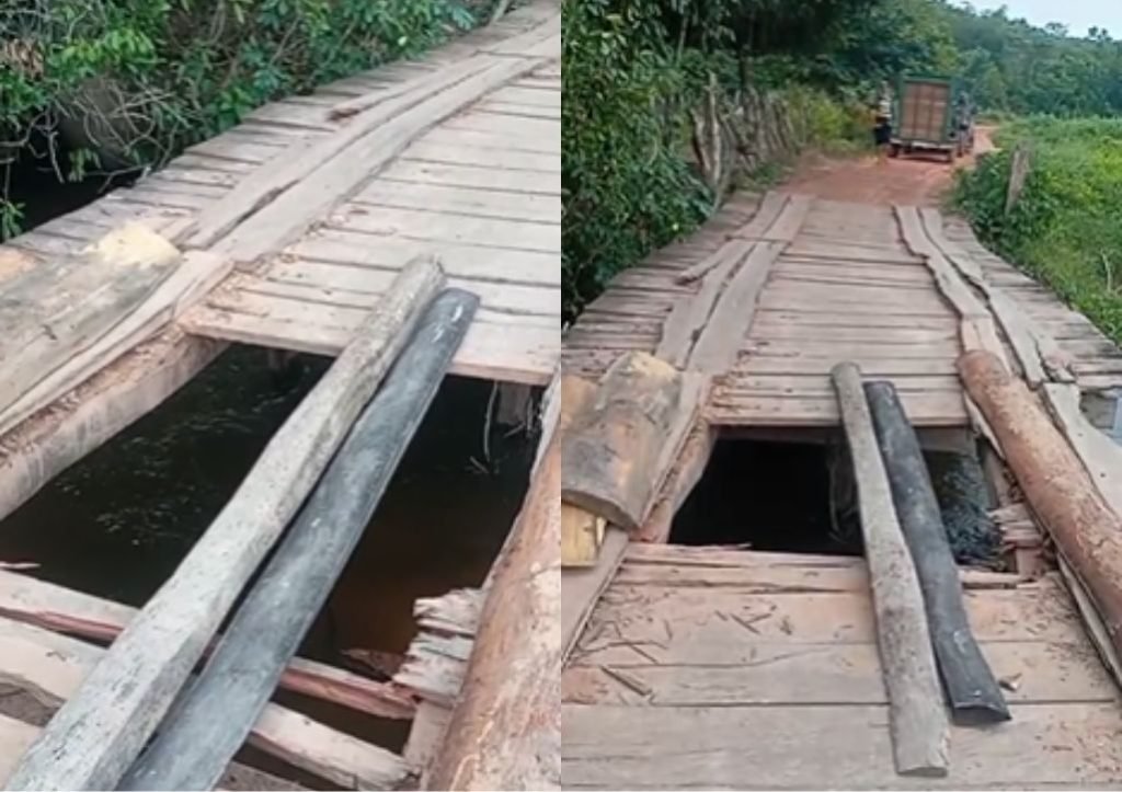 As imagens mostram que parte das tábuas da estrutura cedeu após a passagem de um veículo de grande porte, o que impossibilitou o tráfego regular de moradores pela região.