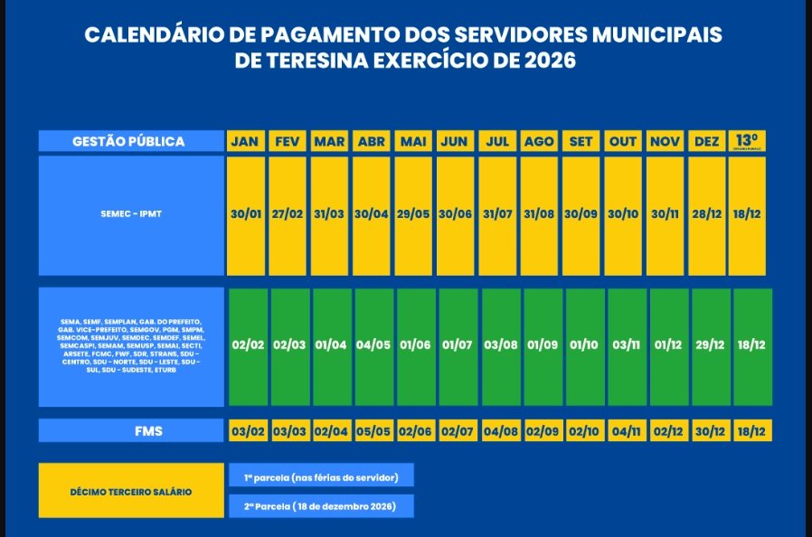 A Prefeitura de Teresina divulgou, nesta terça-feira (27), o calendário de pagamento do salário dos servidores municipais referentes ao exercício de 2026.