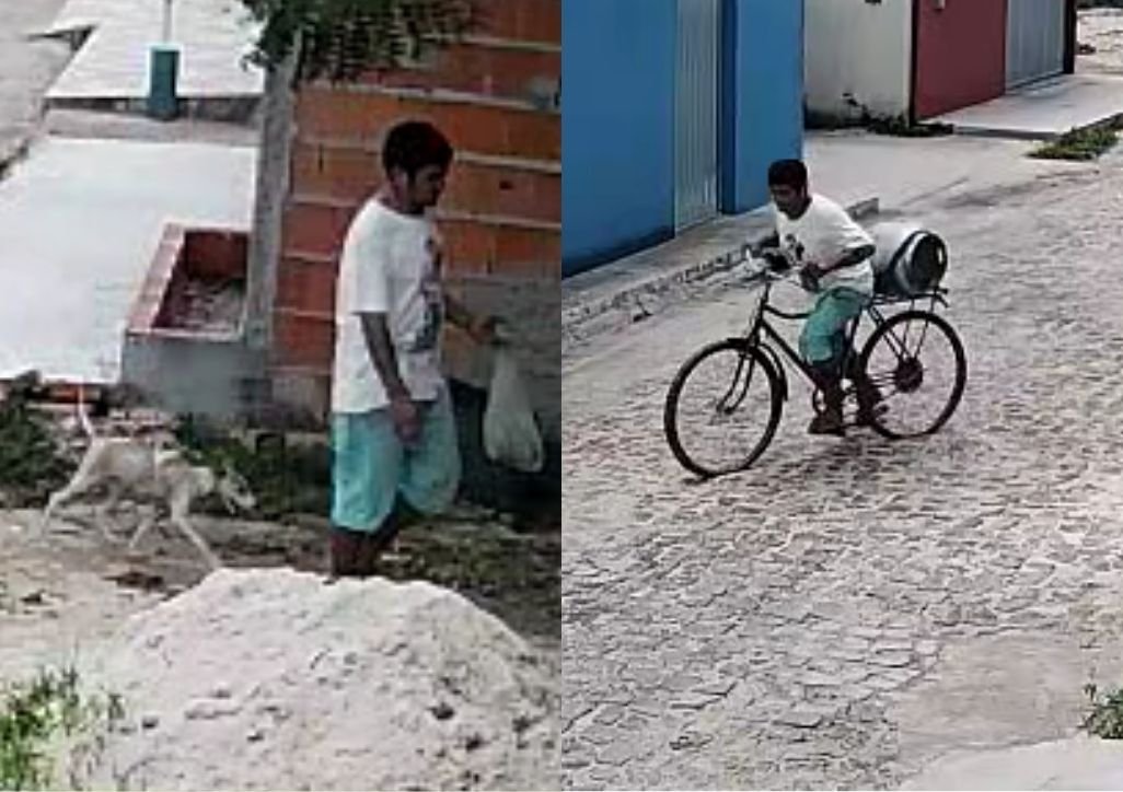 Imagens de uma câmera de segurança registraram o momento em que o homem chegou ao imóvel a pé, acompanhado do animal. Nas gravações, ele aparece entrando na residência com o cachorro e saindo sozinho, levando um botijão de gás e uma bicicleta.