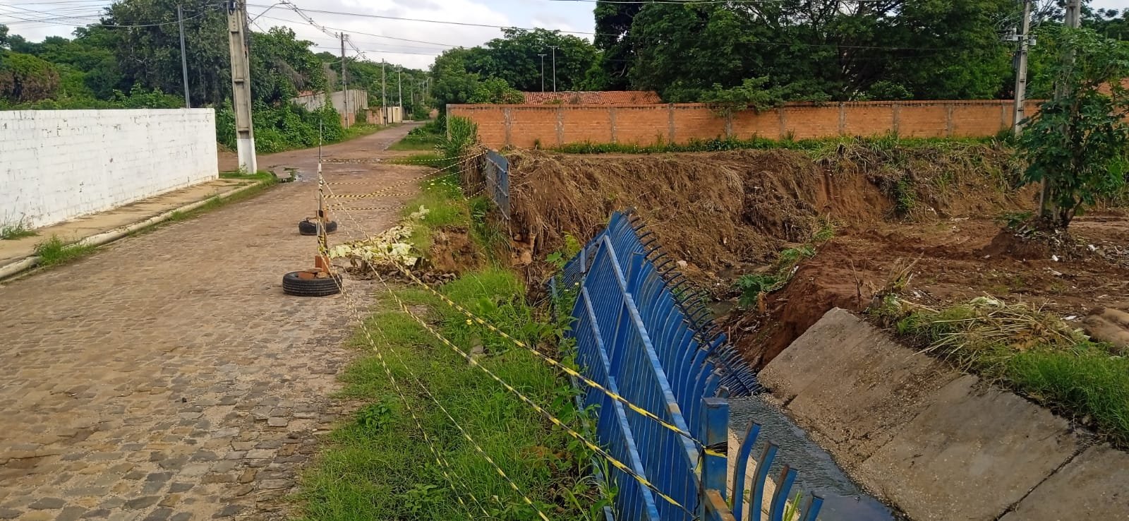 Moradores da Rua Celso Veras, no bairro Esplanada, zona Sul de Teresina (PI), denunciam que parte da via está cedendo por causa da erosão em uma galeria a céu aberto.