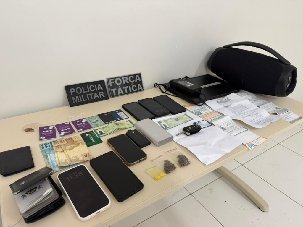 Durante a ação, a guarnição apreendeu seis smartphones, 13 chips telefônicos, documentos de identificação falsos, um notebook, cartões bancários e um pen drive com mais de 50 mil nomes e informações pessoais, incluindo dados bancários, saldos de FGTS e informações trabalhistas.