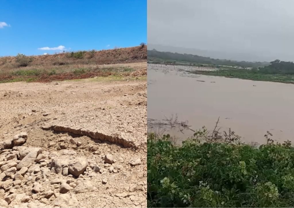 Na sexta-feira, os pluviômetros marcaram 75 mm. No sábado, o volume chegou a 96 mm. Antes das chuvas, imagens feitas por moradores mostravam o açude vazio, com pedras, areia e vegetação expostas.
