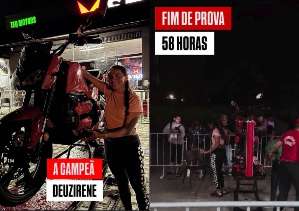 O teste de resistência promovido por uma loja de motos chegou ao fim no município de Floriano, no Sul do Piauí, e a vencedora levou uma motocicleta avaliada em R$ 23 mil. Após 58 horas de prova, Deuzirene Amorim, de 40 anos, foi a grande vencedora do desafio.