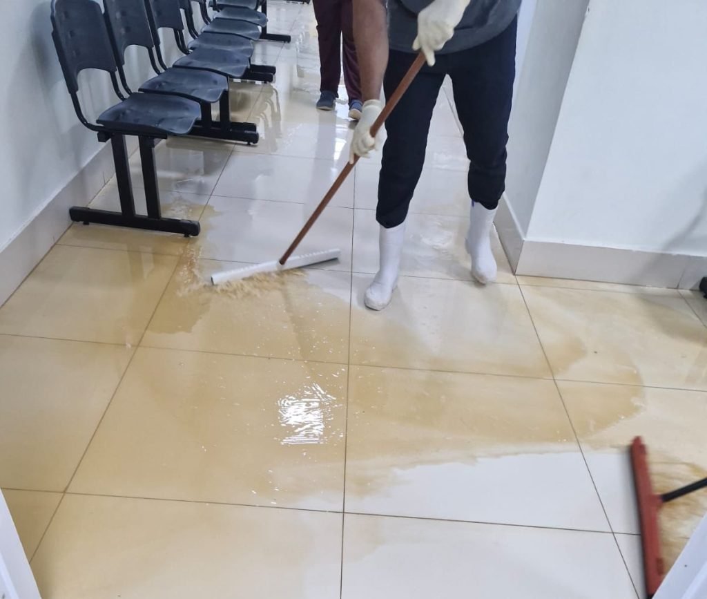 De acordo com o sindicato, vídeos registrados por trabalhadores mostram a sala da Central de Diagnóstico alagada com água e dejetos que saem das fossas e retornam pelos ralos do banheiro. O problema ocorre principalmente em dias de chuva, quando os ralos entopem e transbordam para o setor onde pacientes ficam internados de forma improvisada no pós-operatório.