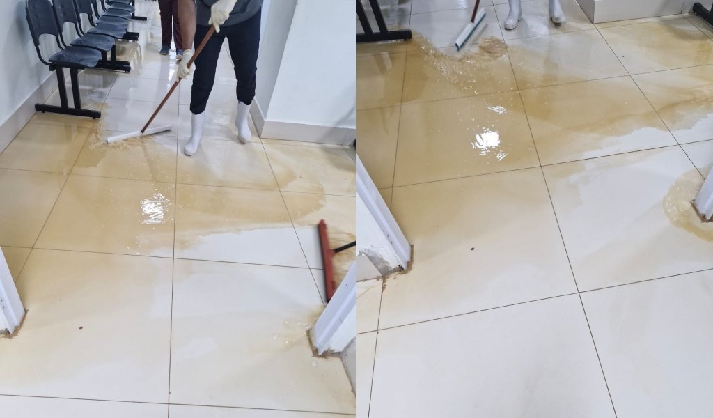De acordo com o sindicato, vídeos registrados por trabalhadores mostram a sala da Central de Diagnóstico alagada com água e dejetos que saem das fossas e retornam pelos ralos do banheiro. O problema ocorre principalmente em dias de chuva, quando os ralos entopem e transbordam para o setor onde pacientes ficam internados de forma improvisada no pós-operatório.