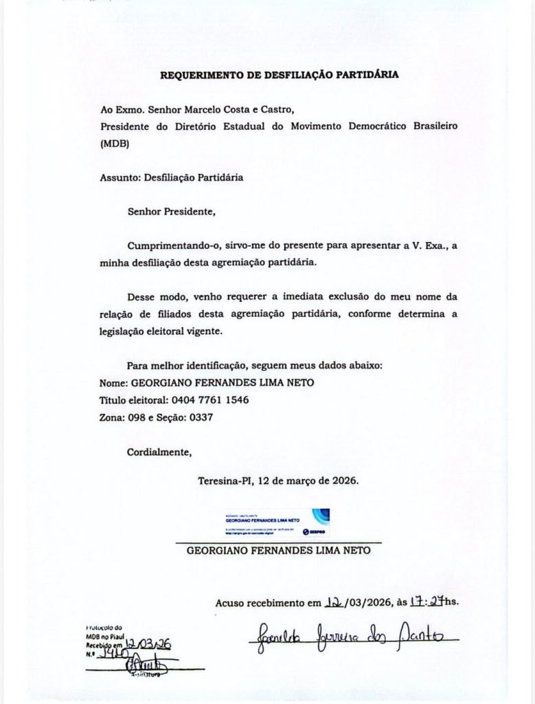 No documento encaminhado ao presidente estadual do MDB, Marcelo Castro, o deputado Georgiano Neto solicita a exclusão imediata do seu nome da relação de filiados da agremiação partidária.