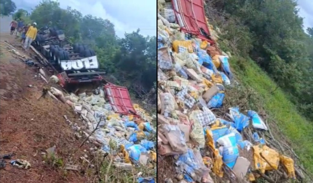 Imagens registradas por pessoas que passavam pelo local mostram a carreta às margens da rodovia e a carga espalhada pela pista.