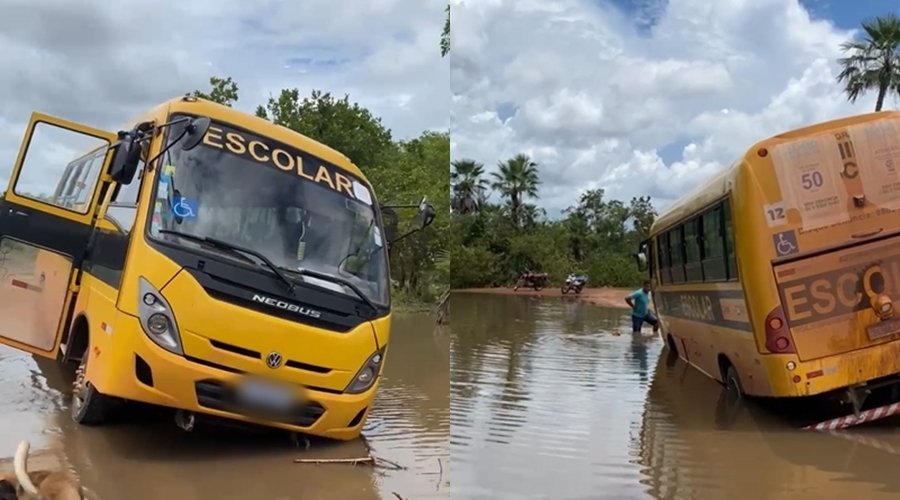 Um ônibus escolar ficou atolado em um buraco e quase tombou após tentar atravessar uma passagem molhada, nessa quinta-feira (19), no riacho Merinzeiro, zona rural de José de Freitas (PI). Ninguém ficou ferido.
