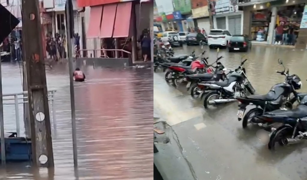 As imagens mostram pessoas que estavam em estabelecimentos próximos surpresas com a cena. Em um outro registro, no mesmo trecho onde o morador toma banho, motos estacionadas estão parcialmente cobertas pela água.