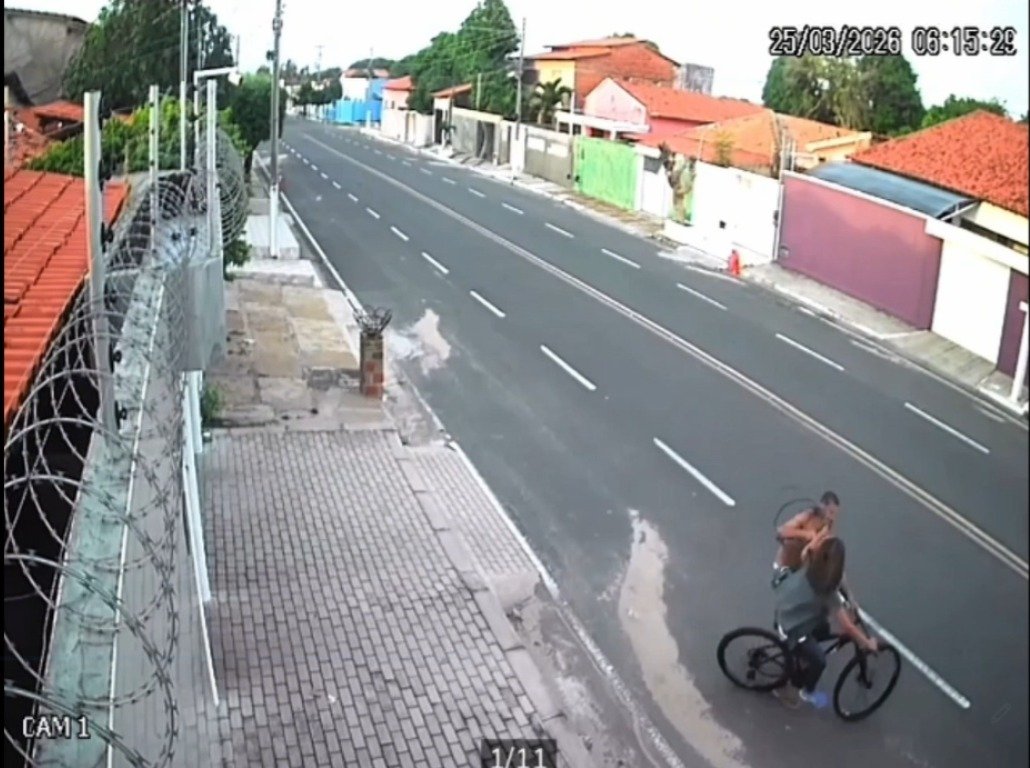 Uma câmera de segurança registrou o momento em que a vítima passa de bicicleta pela via e é seguida pelo suspeito, que corre até alcançá-la.