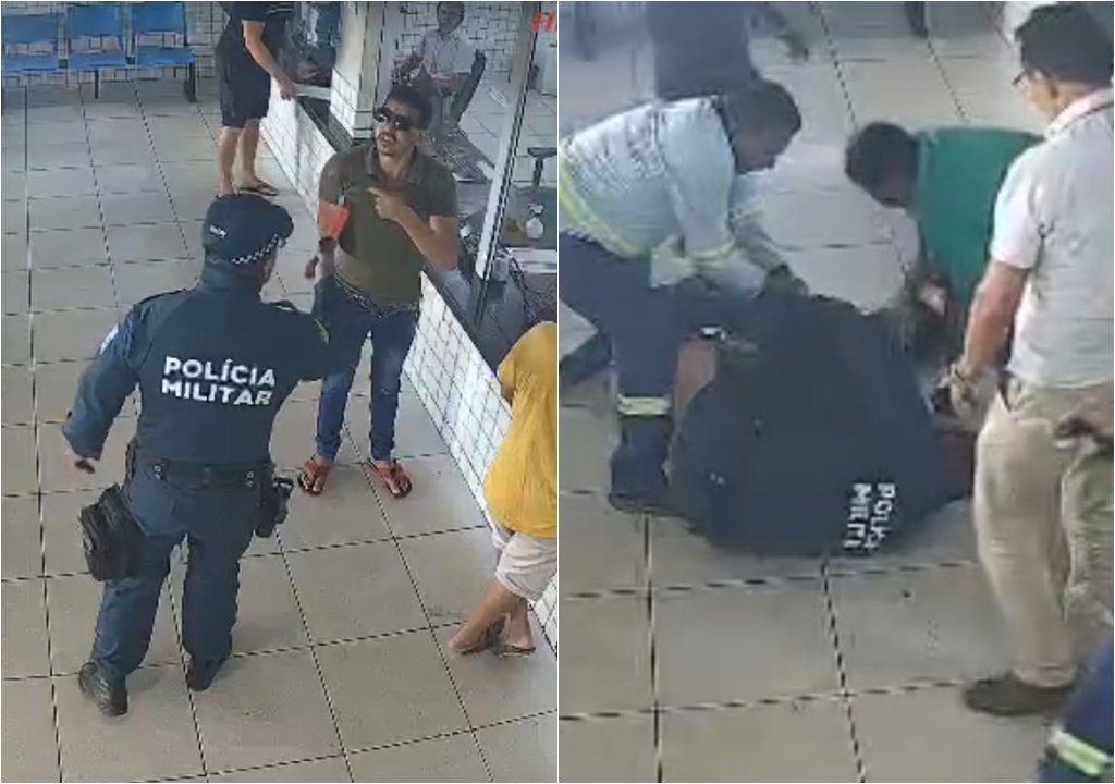 As imagens de segurança mostram o momento em que a discussão se transforma em agressão física, quando o policial vai pra cima do homem, chamando a atenção de pessoas que estavam no posto fiscal naquele momento.