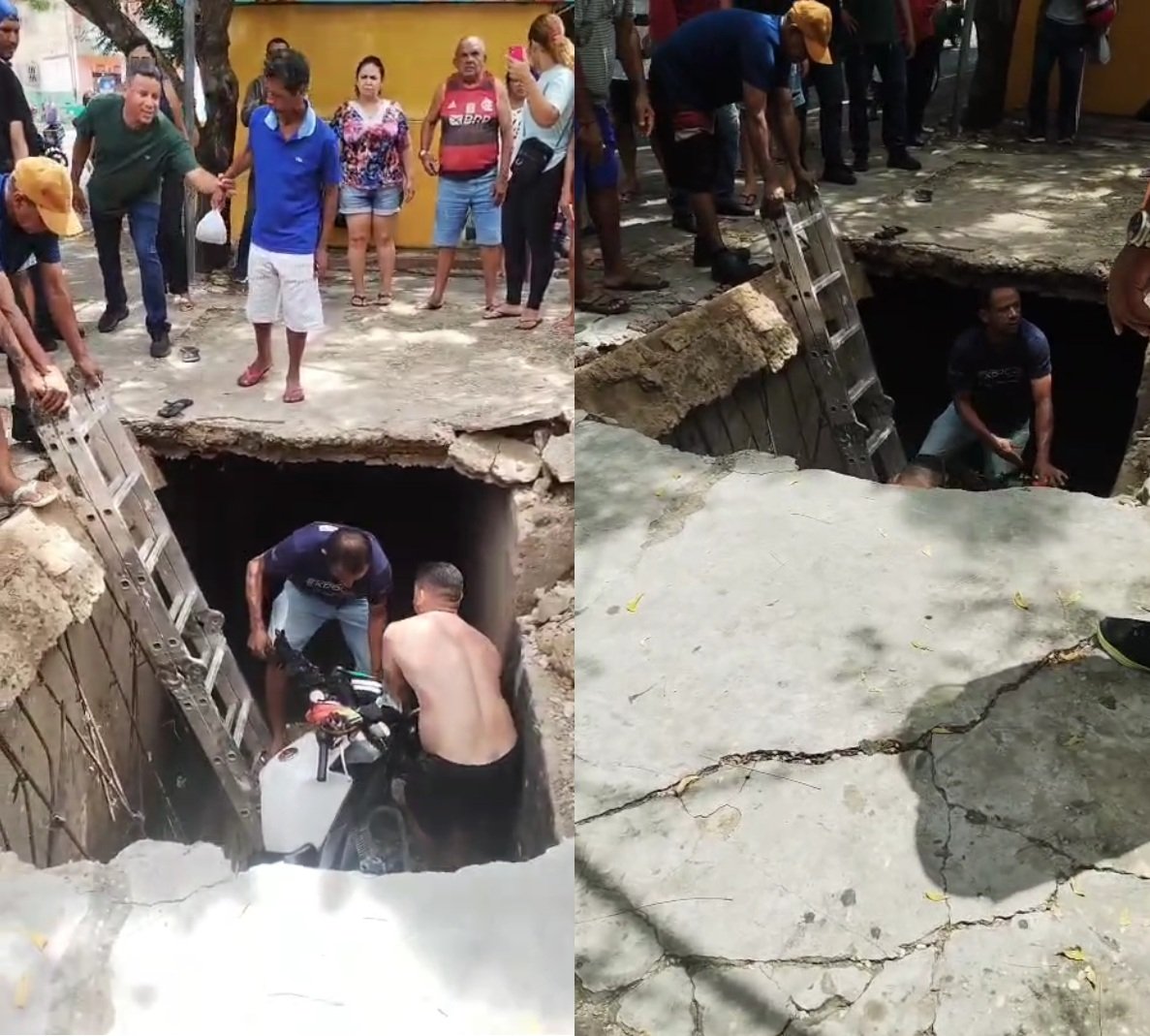 Um vídeo mostra o motociclista sendo resgatado por populares, que também ajudaram a retirar o veículo da galeria. O Serviço de Atendimento Móvel de Urgência (Samu) foi acionado e socorreu os feridos.