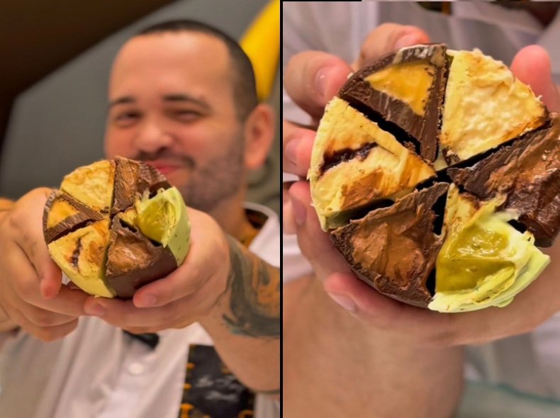 Em Teresina, quem saiu na frente foi o Bruno Ribeiro, proprietário de uma confeitaria na capital, que já incorporou o produto ao cardápio especial de Páscoa. Segundo ele, o ovo reúne os sabores de pistache, brigadeiro belga, brigadeiro tradicional, cocada, frutas vermelhas e caramelo salgado, todos presentes tanto na casca quanto no recheio.