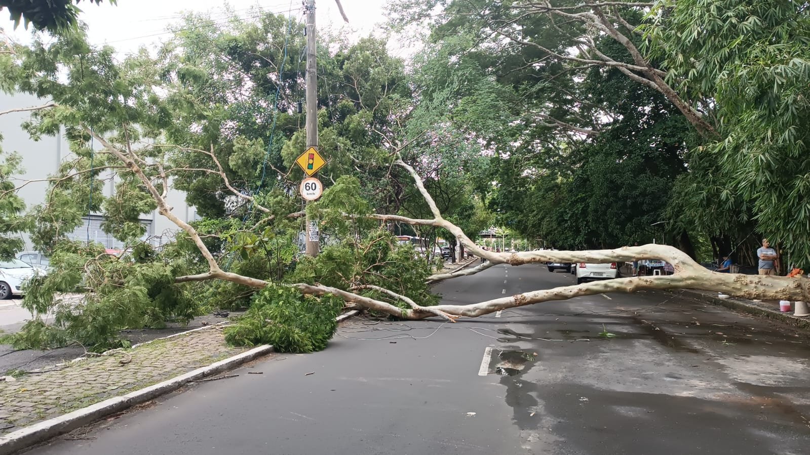 Nas imagens gravadas por Giscarde Oliveira, é possível que parte da fiação elétrica foi atingida pela árvore. A interdição acontece nas duas vias da avenida e apenas uma pista no sentido Norte/Sul está liberada.