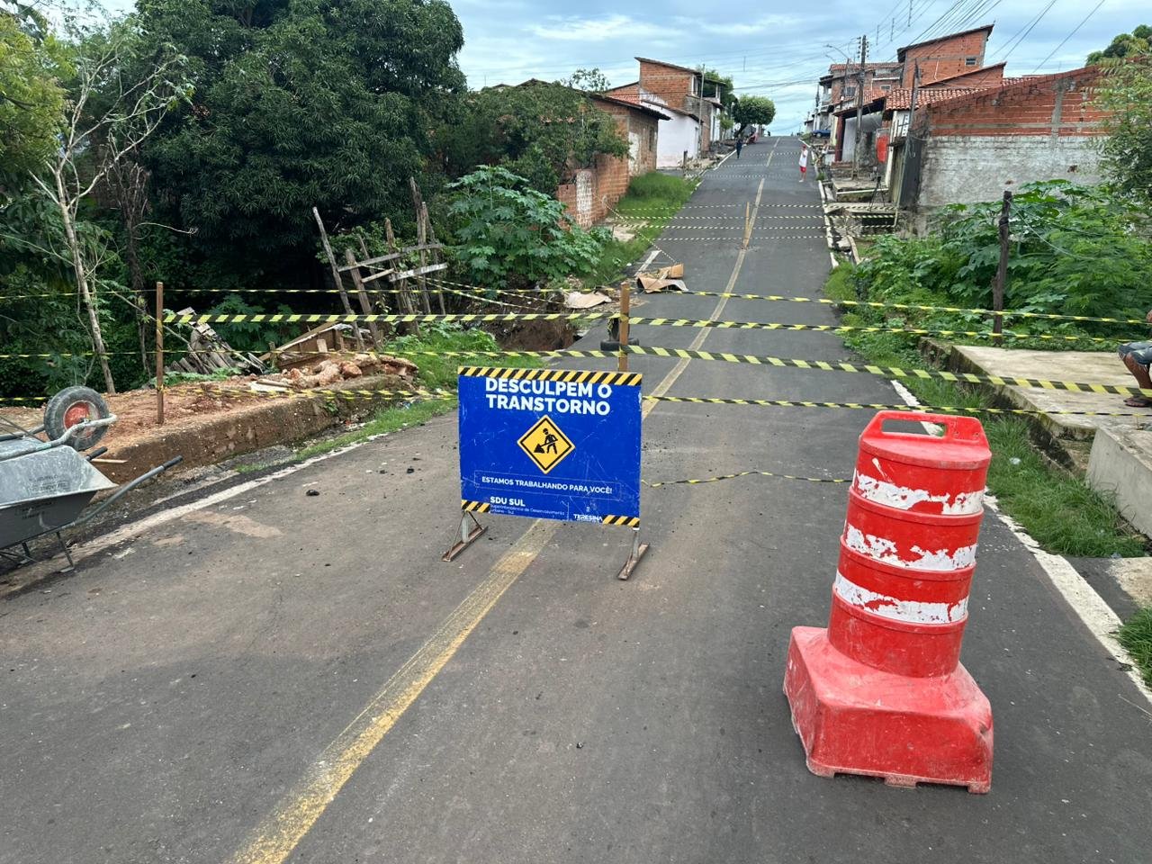Um trecho da Rua Uruçuí, localizada na Vila da Paz, zona Sul de Teresina, foi interditado nesta quarta-feira (8) após a identificação de uma erosão de grandes proporções. A previsão é que os trabalhos sejam concluídos em cerca de 20 dias, quando a via deverá ser liberada para o tráfego.