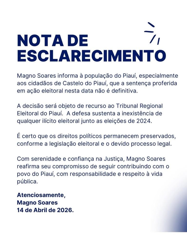 O ex-prefeito Magno Soares também se manifestou sobre a decisão e afirma que não há nada ilícito na campanha eleitoral de 2024. Ele também vai recorrer da decisão.