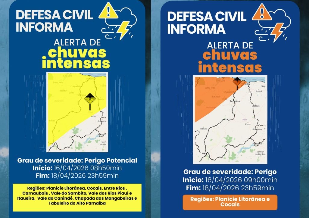O estado do Piauí está sob dois alertas emitidos pela Defesa Civil. O alerta amarelo, de perigo potencial, compreende os municípios localizados nos territórios da Planície Litorânea, Cocais, Entre Rios, Carnaubais, Vale do Sambito, Vale dos Rios Piauí e Itaueira, Vale do Canindé, Chapada das Mangabeiras e Tabuleiros do Alto Parnaíba, com validade até as 23h59 do sábado (18).