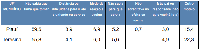 O estado foi o que concentrou o maior percentual de jovens que disseram desconhecer a necessidade da vacina. Entre as capitais, Teresina lidera esse índice: 55,8% dos jovens afirmaram não saber que precisavam se vacinar. Em seguida aparecem Salvador (54,4%) e Aracaju (53,9%).