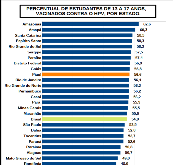 A pesquisa aponta ainda que, em 2024, a taxa de imunização no Piauí foi maior entre as meninas: 59,4% declararam ter recebido a vacina. Entre os meninos, o índice foi de 53,7%.
