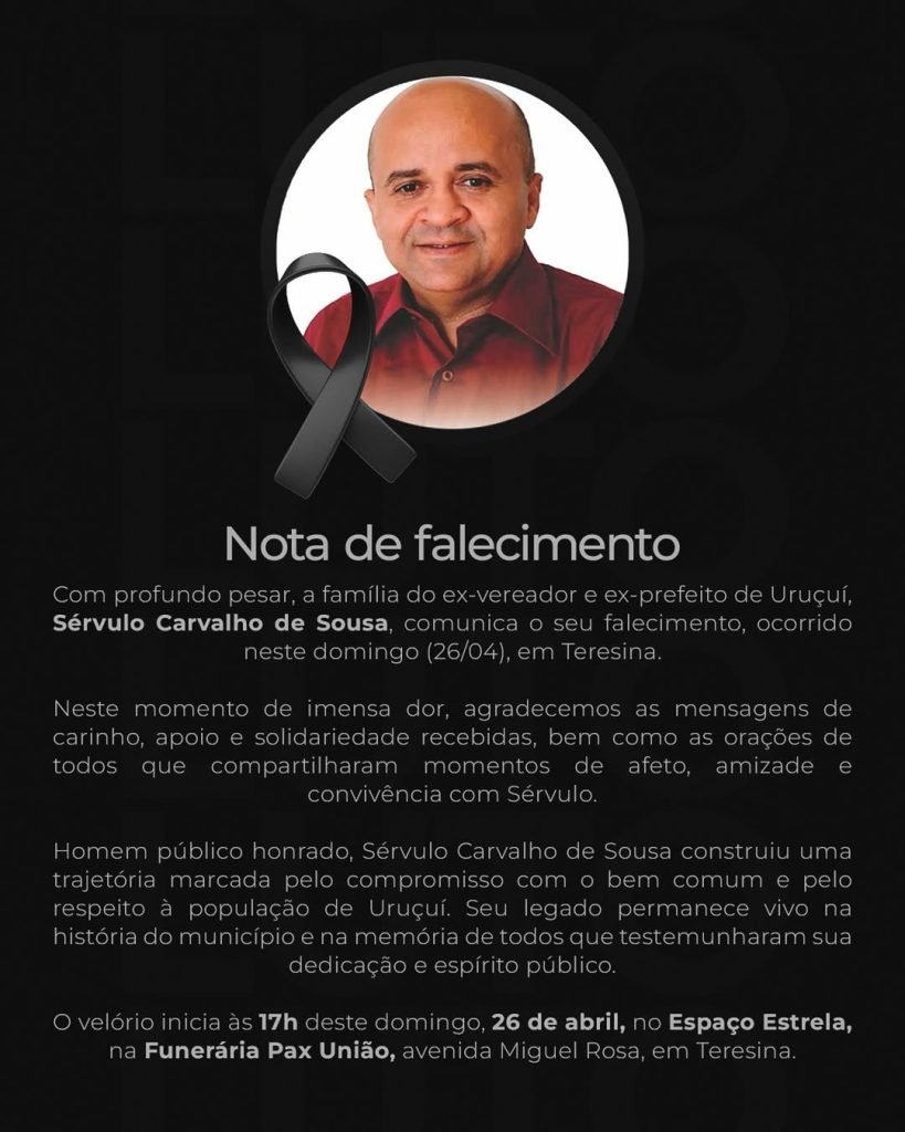 “Lamento profundamente o falecimento do companheiro Sérvulo Carvalho, importante liderança política do município de Uruçuí. Sérvulo deixa um legado de dedicação e trabalho na luta pela democracia e pela melhoria da qualidade de vida da população local. Neste momento de dor, manifesto minha solidariedade e envio um abraço fraterno aos familiares e amigos”, escreveu.