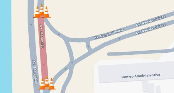 A Avenida Maranhão passa por interdição parcial a partir desta terça-feira (28), no sentido Sul–Norte, no cruzamento com a Avenida Nações Unidas. A medida foi anunciada como parte de uma intervenção para melhorar a fluidez do trânsito na região do Centro Administrativo.