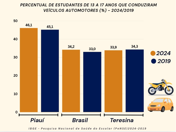 O Piauí registra o sexto maior percentual do país de adolescentes que já conduziram veículos motorizados sem possuir carteira de habilitação. É o que aponta a Pesquisa Nacional de Saúde do Escolar (PeNSE) 2024, divulgada nesta quarta-feira (29) pelo Instituto Brasileiro de Geografia e Estatística (IBGE).